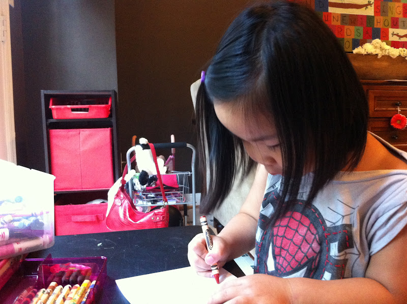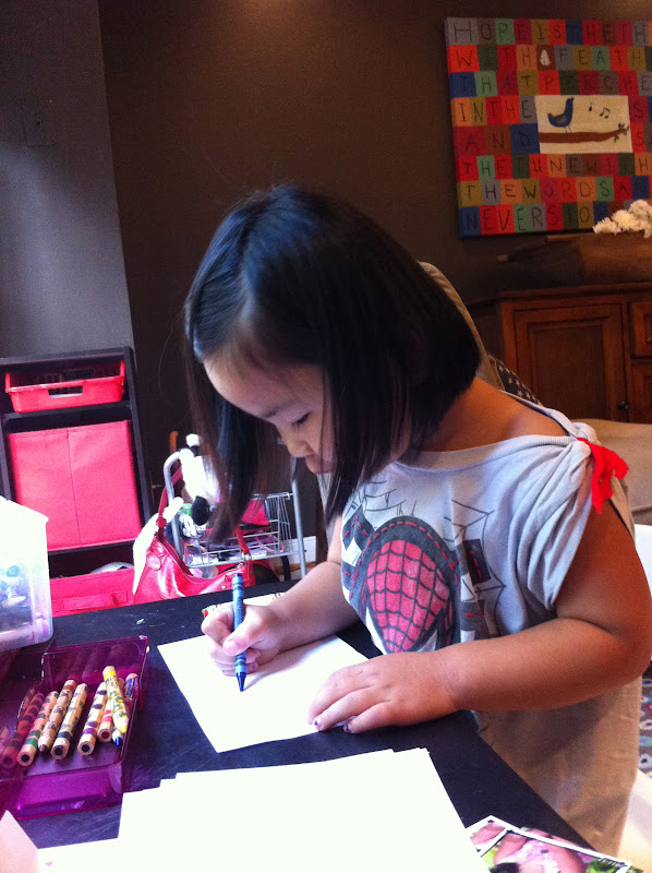 I trimmed them down a little, and folded them, and little M went to work writing and coloring in them.